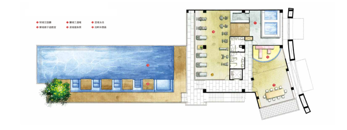國際級健康渡假休閒會館公設-三溫暖、漾境健身房、樂境親子空間、悅境交誼廳、25M無邊際泳池
